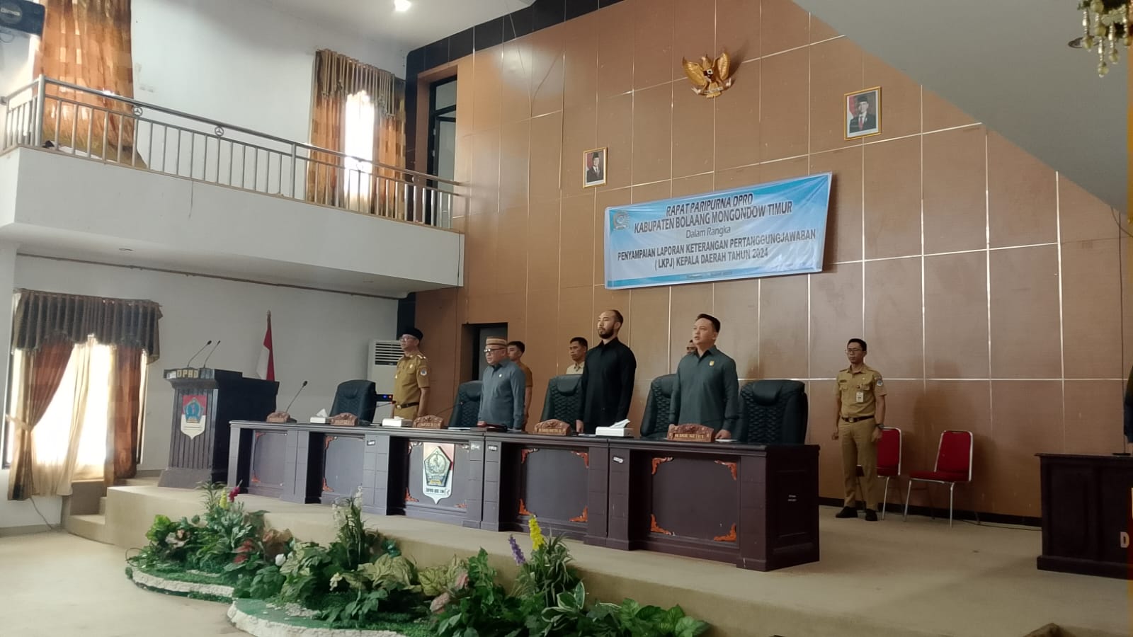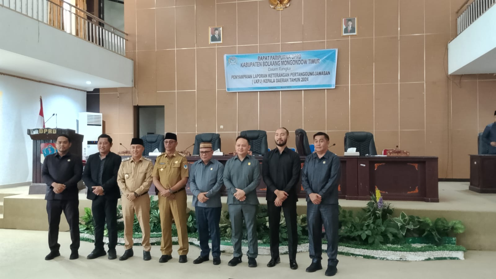 Dalam Penyampaian Bupati Bolaang Mongondow Timur Oskar Manoppo SE, MM menyampaikan, Berdasarkan peraturan menteri dalam negeri nomor 19 tahun 2024, tentang peraturan dalam pelaksanaan pemerintahan Nomor 13 tahun 2019, tentang laporan dan evaluasi penyelenggaraan pemerintahan daerah berkewajiban menyampaikan laporan pertanggung jawaban tahun sebelumnya, Kepada Dewan DPRD Kabupaten Bolaang Mongondow Timur paling lambat tiga bulan sebelum anggaran berakhir.