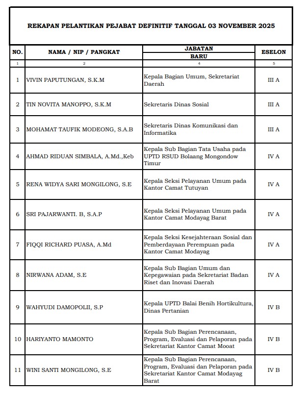 IKNews, BOLTIM – Proses penataan birokrasi di Kabupaten Bolaang Mongondow Timur (Boltim) kembali berlanjut. Senin (3/11/2025), Bupati Oskar Manoppo bersama Wakil Bupati Argo V. Sumaiku melantik 13 pejabat administrator dan pengawas di lingkungan pemerintahan kabupaten. Acara berlangsung di Aula Kantor Bupati, dihadiri Ketua DPRD Samsudin Dama, sejumlah asisten, serta pimpinan Organisasi Perangkat Daerah (OPD).
