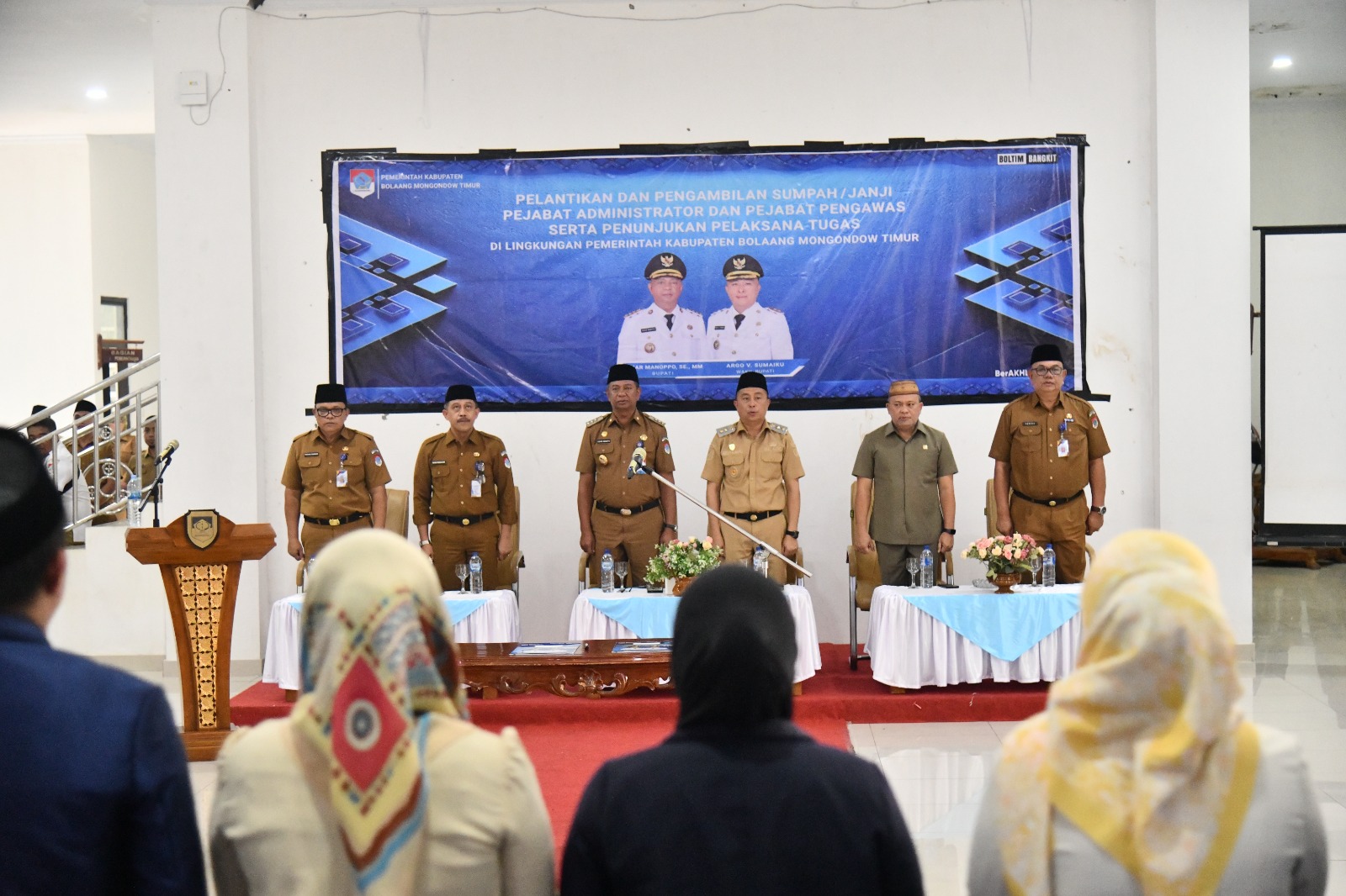 Gambar: Bupati Oskar Manoppo dan Wakil Bupati Argo V. Sumaiku melantik 13 pejabat administrator dan pengawas di lingkungan Pemerintah Kabupaten Bolaang Mongondow Timur, Senin, 3 November 2025. Kegiatan berlangsung di Aula Kantor Bupati Boltim. (Foto:klas/IKN).