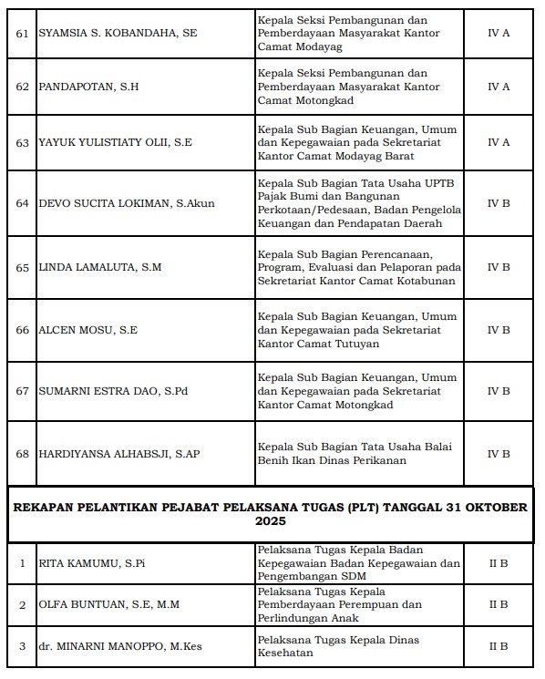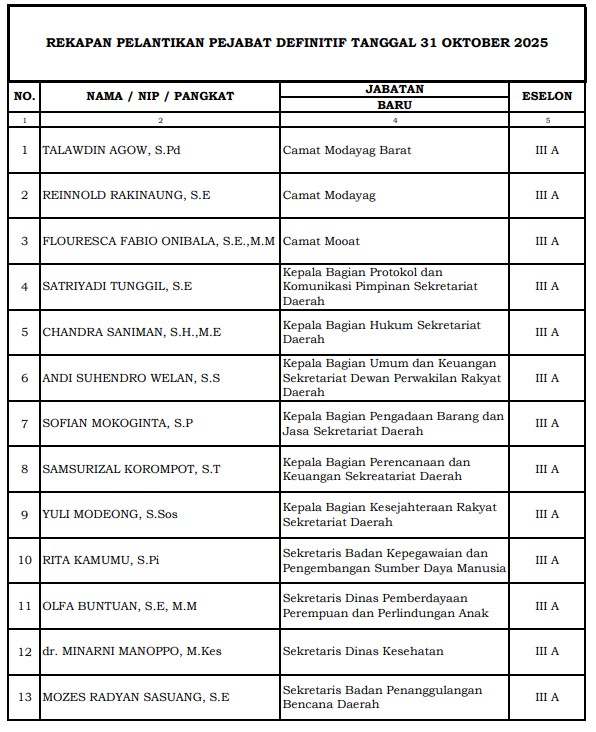 IKNews, BOLTIM — Pemerintah Kabupaten Bolaang Mongondow Timur (Boltim) kembali melakukan rotasi jabatan di lingkungan birokrasi. Bupati Boltim Oskar Manoppo, didampingi Wakil Bupati Argo V. Sumaiku, melantik sejumlah pejabat Eselon III dan IV sekaligus mengambil sumpah/janji jabatan bagi pejabat administrator dan pengawas. Kegiatan berlangsung di Kantor Bupati Boltim, Jumat (31/10/2025).