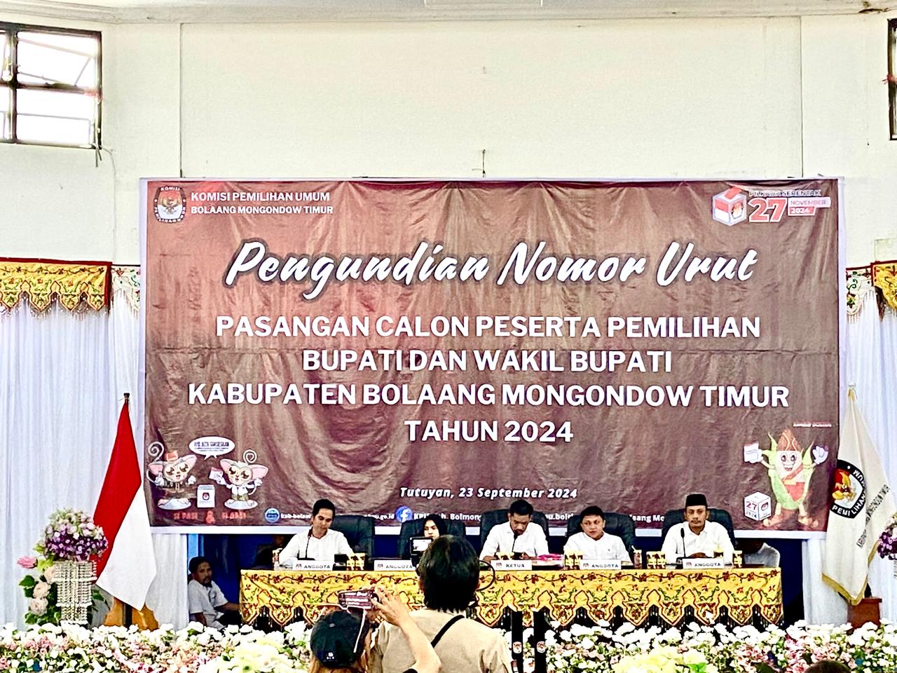 IKNews, BOLTIM – Komisi Pemilihan Umum (KPU) Bolaang Mongondow Timur (Boltim). melaksanakan rapat pleno terbuka untuk pengundian dan penetapan nomor urut pasangan calon (paslon) pemilihan Bupati dan Wakil Bupati tahun 2024.yang bertempat lantai tiga Kantor Bupati.Senin, (23/09/2024),