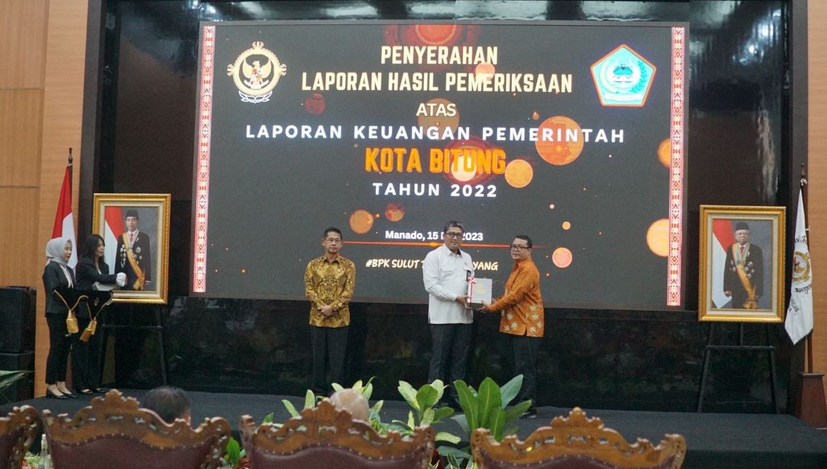 Laporan keuangan Pemerintah Kota Bitung, Wajar Tanpa Pengecualian. Anggota VI Badan Pemeriksa Keuangan (BPK) RI Dr. Pius Lustrilanang, S.IP., M.Si., CFrA., CSFA saat menyampaikan sambutan, Sebelumnya, Kepala Perwakilan Badan Pemeriksa Keuangan (BPK), Arief Fadillah S.E., M.M., CSFA menyerahkan Laporan Hasil Pemeriksaan Atas Laporan Keuangan Pemerintah Kota Bitung.