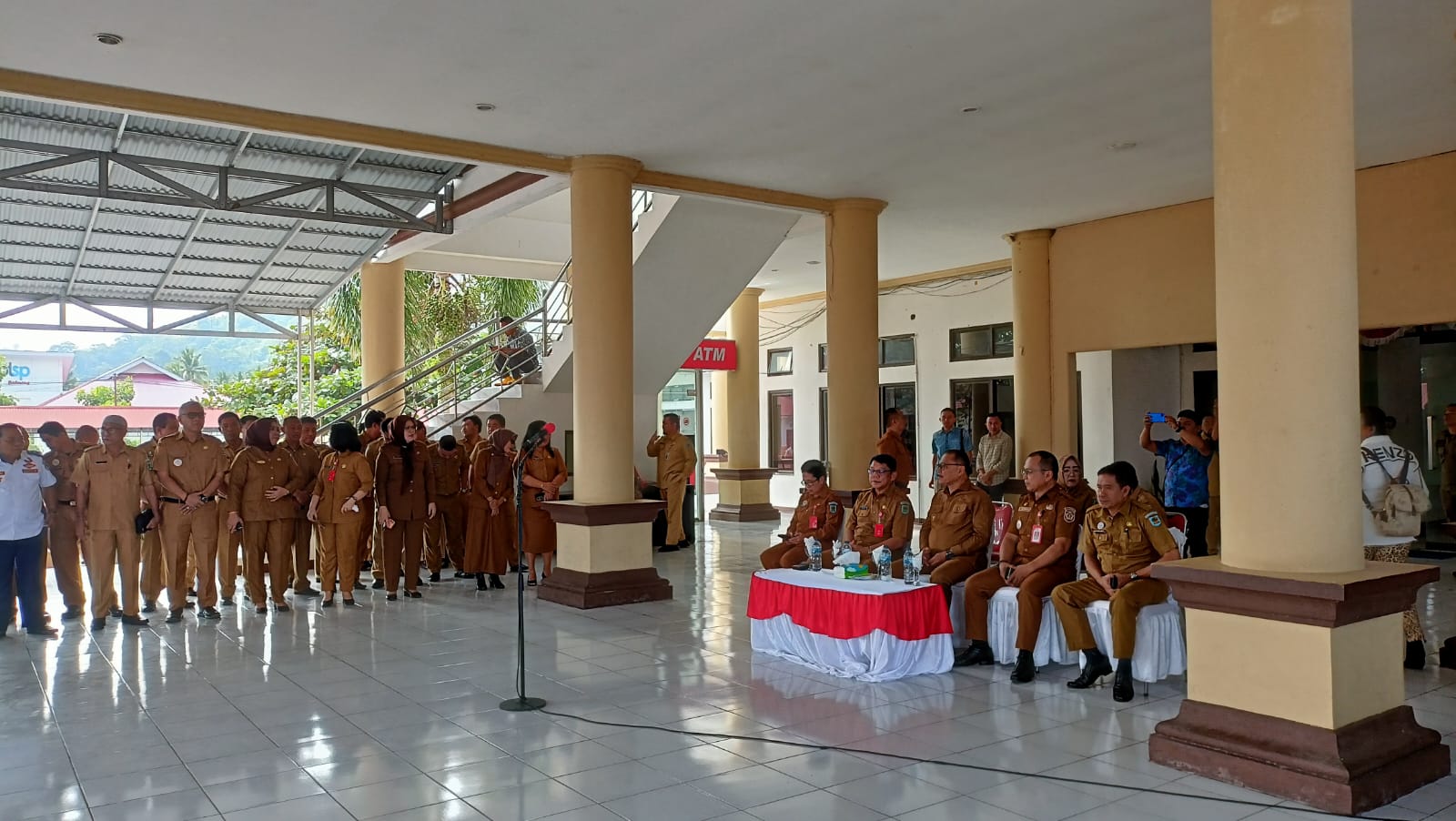 Pj Bupati Ir Limi Mokodompit M.M bersama pimpinan Organisasi Perangkat Daerah (OPD) memimpin langsung apel kerja perdana Pemerintah Kabupaten Bolaang Mongondow paska libur dan cuti bersama lebaran Selasa, 16 April 2024.