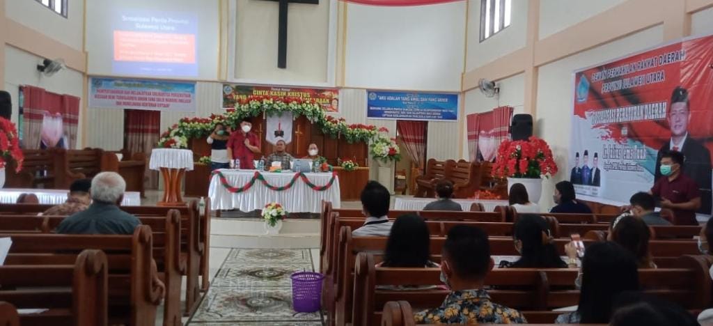 Anggota DPRD Provinsi Sulawesi Utara (Sulut), Julius Jems Tuuk menggelar Sosialiasasi Peraturan Daerah (SosPer) Perlindungan dan Pemberdayaan Disabilitas dan Bantuan Hukum bagi masyarakat miskin, di Gedung Gereja Masehi Injili di Bolaang Mongondow (GMIBM) Petra Pangian, Desa Pangian Tengah, Kecamatan Passi Timur, Selasa (25/01).