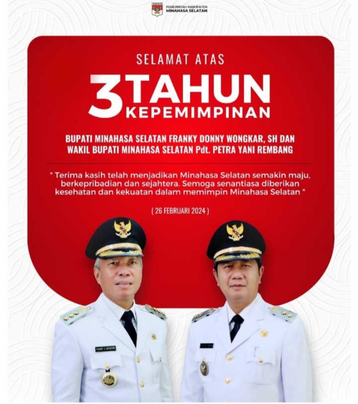 IKNews,Minsel – Tiga Tahun Pemerintahan Kabupaten Minahasa Selatan di bawah pimpinan Bupati Franky D Wongkar SH dan Wakil Bupati Petra Yanni Rembang MTH, Berbagai Pencapaian Dan Prestasi serta Penghargaan yang boleh dicapai dari tahun 2021 Sampai Tahun 2023.