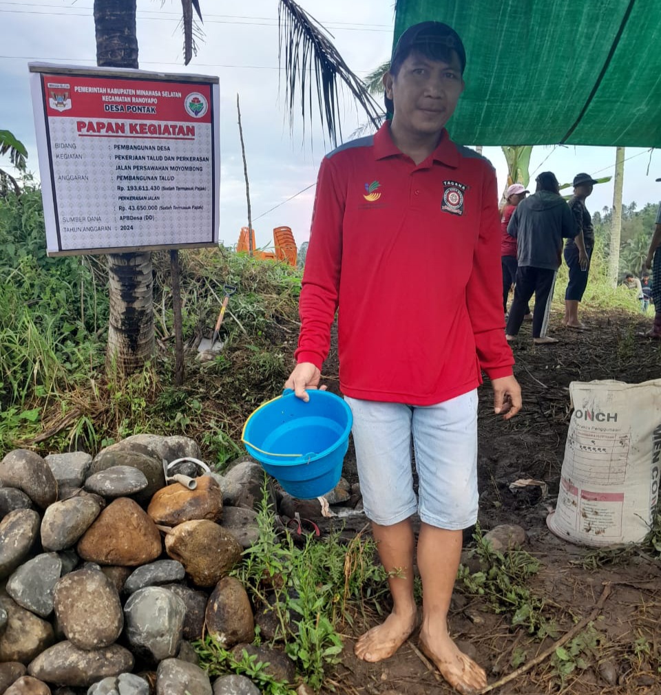 IKNews,Minsel – Pemerintah Desa (Pemdes) Pontak Kecamatan Ranoyapo Kabupaten Minahasa Selatan, Realisasikan Dana Desa (DD) T.A 2024, sebagaimana tertata dalam Anggaran Pendapatan Belanja Desa (APBDes) melalui Bidang Pembangunan Desa, Kegiatan Pembangunan Talud dan Perkerasan Jalan Persawahan Moyombong (lihat papan informasi).
