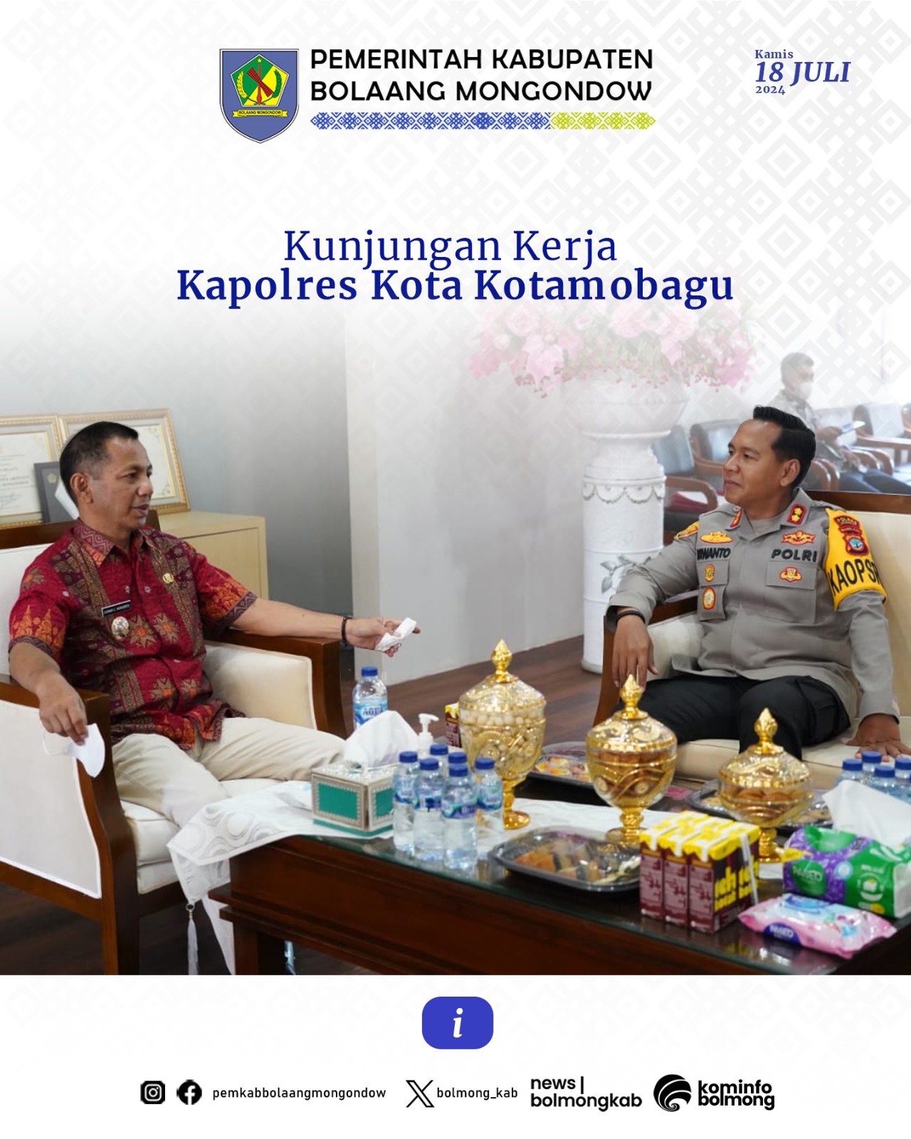 IKNews, BOLMONG – Penjabat Bupati Bolaang Mongondow (Bolmong), dr. Jusnan Calamento Mokoginta, M.A.R.S didampingi pejabat Pemkab Bolmong menyambut baik Kunjungan Kerja (Kunker) Kapolres Kotamobagu, AKBP. Irwanto, SIK., MH di ruang kerjanya, Kamis (18/7/24).