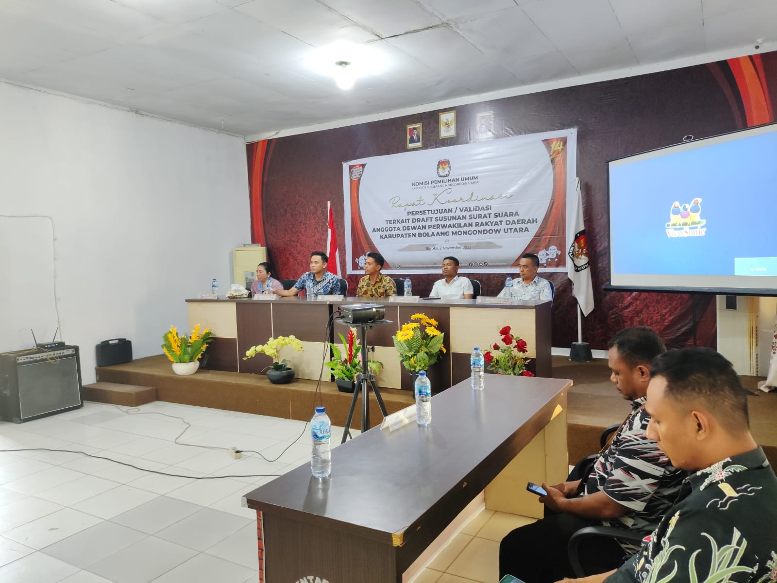 IKNews, BOLMUT – Komisi Pemilihan Umum (KPU) Kabupaten Bolaang Mongondow Utara (Bolmut) melaksanakan Rapat Koordinasi Validasi Rancangan Surat Suara Calon Anggota Dewan Perwakilan Rakyat Daerah (DPRD). Kamis (02/11/2023) bertempat di ruang rapat KPU Bolmut.