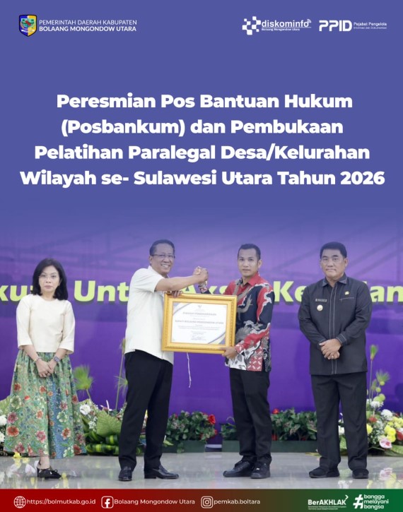 IKNews, MANADO – Pemerintah Kabupaten Bolaang Mongondow Utara (Boltara) menerima penghargaan dari Kementerian Hukum Republik Indonesia atas dukungannya dalam pembentukan Pos Bantuan Hukum (Posbankum) di tingkat desa dan kelurahan.
