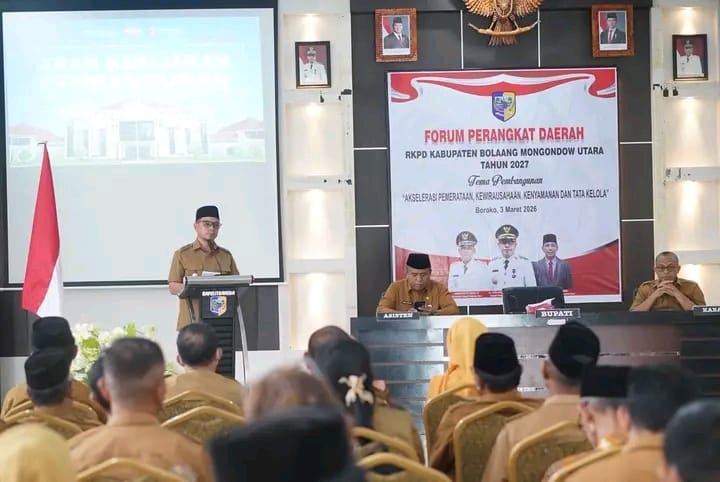 IKNews, BOLTARA – Bupati Bolaang Mongondow Utara (Boltara), Dr. Sirajudin Lasena, SE., M.Ec.Dev, membuka Forum Perangkat Daerah RKPD Kabupaten Bolaang Mongondow Utara Tahun 2027 di Aula Kantor Bapelitbangda Boltara, Selasa (03/03/2026). Forum ini bertujuan untuk melakukan sinkronisasi dan harmonisasi program dan kegiatan perangkat daerah dengan hasil musrembang desa dan kecamatan.