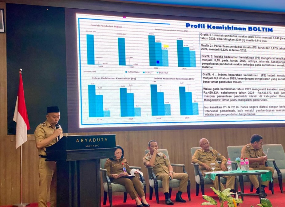 Dalam Rapat Koordinasi dan Evaluasi (Rakorev) Penanggulangan Kemiskinan tahun 2025 yang digelar di Manado, Selasa (7/10/2025), Wakil Bupati Boltim Argo V. Sumaiku memaparkan bahwa jumlah penduduk miskin di daerahnya turun dari 4.410 jiwa pada 2024 menjadi 4.040 jiwa di 2025. Persentasenya menurun dari 5,87% menjadi 5,32%.