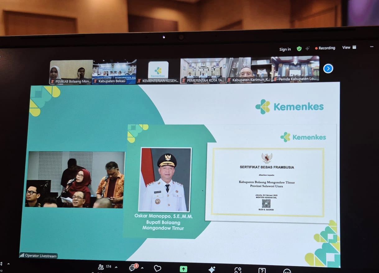 IKNews, BOLTIM – Wakil Bupati Bolaang Mongondow Timur (Boltim) Argo V. Sumaiku mengikuti penyerahan sertifikat bebas Frambusia yang diselenggarakan oleh Kementerian Kesehatan Republik Indonesia melalui zoom meeting pada Rabu sore, 20 Agustus 2025. Bertempat di Manado.