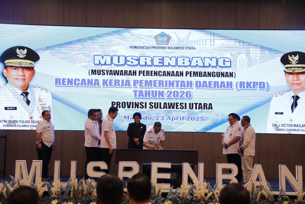 Diketahui Bupati Boltim Oskar Manoppo, SE, MM mewakili Kabupaten se Sulut menandatangani Berita Acara Kesepakatan Musrenbang RKPD Provinsi Sulut Tahun 2026 disaksikan Wakil Gubernur Sulut Victor Mailangkay, SH, MH.*