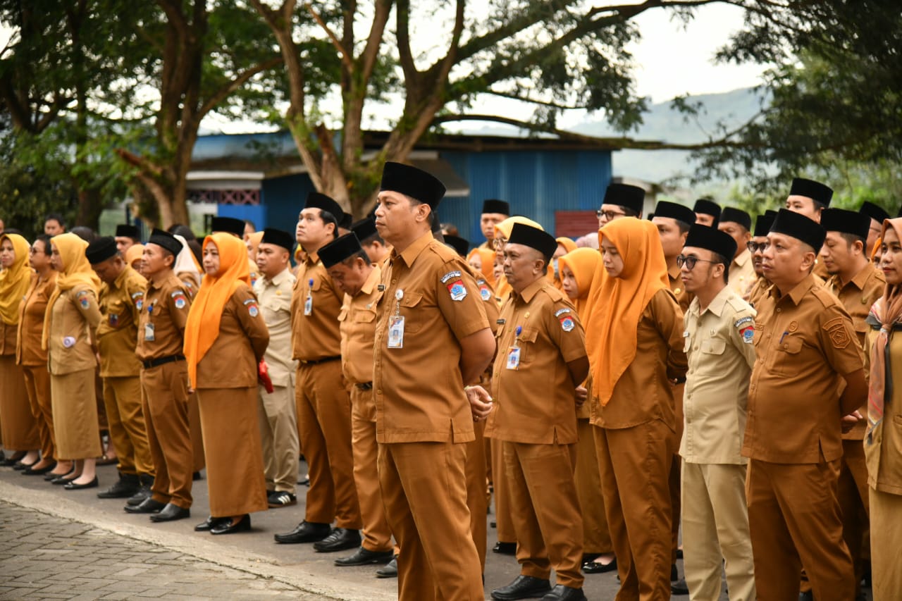 Bupati Bolaang Mongondow Timur, Oskar Manoppo, memimpin apel kerja pada minggu kedua bulan Juli 2025 di halaman Kantor Bupati. Foto : Muklas