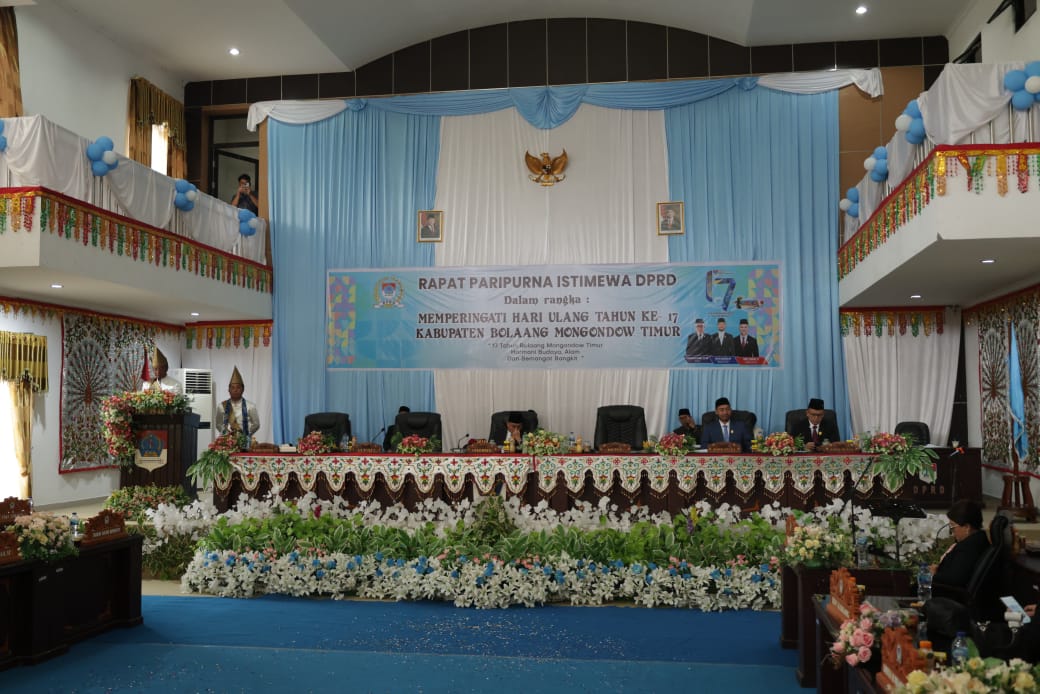 IKNews, BOLTIM – Pemerintah Kabupaten Bolaang Mongondow Timur menggelar Rapat Paripurna Istimewa DPRD dalam rangka memperingati Hari Ulang Tahun ke-17 Kabupaten Boltim. Paripurna berlangsung khidmat di ruang sidang DPRD Boltim, Senin (21/07/2025), dan dihadiri langsung oleh Bupati Boltim Oskar Manoppo bersama Wakil Bupati Argo V. Sumaiku.