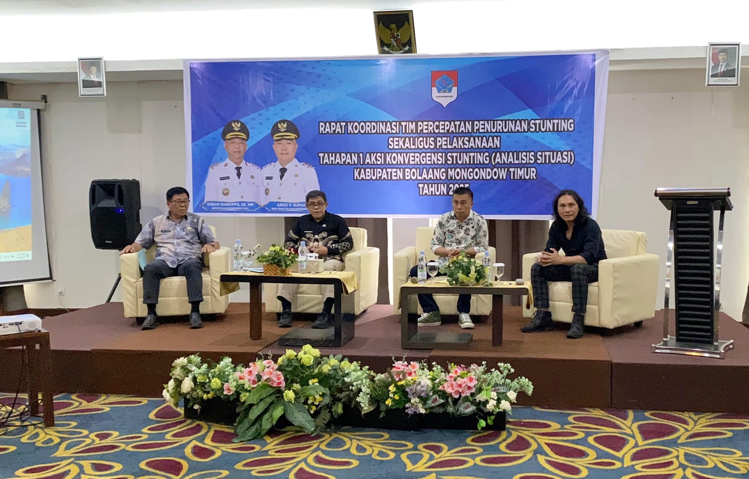 Pencegahan dan penurunan stunting Dan pelaksanaan tahapan satu aksi konvengensi stunting Kabupaten Bolaang Mongondow Timur, berlangsung di Hotel Sutan Raja Kotamobagu dan dihadiri oleh seluruh pejabat tinggi pratama, administrator, pengawas dan staf pelaksana di lingkungan Pemerintah Kabupaten (Pemkab) Boltim, pada Kamis (13/3/2025) siang.