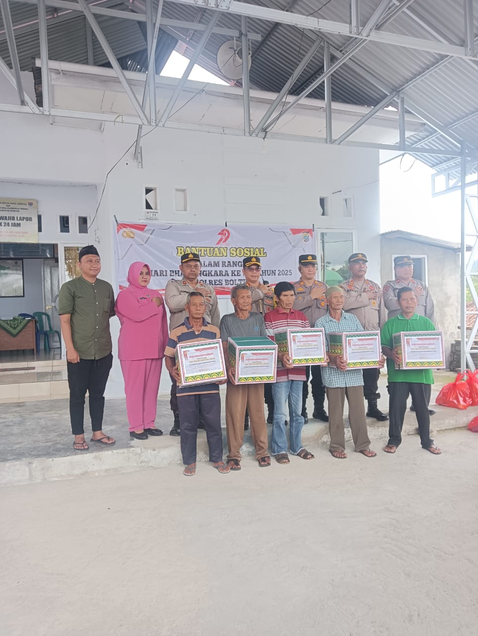 Ia juga menjelaskan, Penyerahan bantuan ini di lakukan oleh jajaran Polres Boltim bersama Bhayangkari dalam rangka peringatan Hari Ulang Tahun (HUT) Ke-79 Bhayangkara yang dilaksanakan setiap tahunnya pada 1 Juli.” Peringati HUT Ke-79 Bhayangkara, menyerahkan bantuan bahan pokok kepada masyarakat yang membutuhkan di desa saya,” singkatnya.