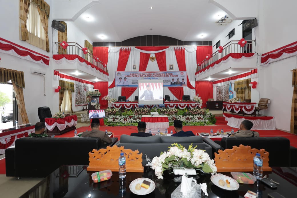 Rapat paripurna istimewa DPRD Kabupaten Bolaang Mongondow Timur dipimpin oleh Wakil Ketua DPRD Kabupaten Bolaang Mongondow Timur, Kevin Sumendap didampingi Medy Lensun, dan turut dihadiri jajaran Forum Koordinasi Pimpinan Daerah (Forkopimda), pimpinan dan anggota DPRD, para kepala Organisasi Perangkat Daerah (OPD), serta jajaran pemerintah daerah.