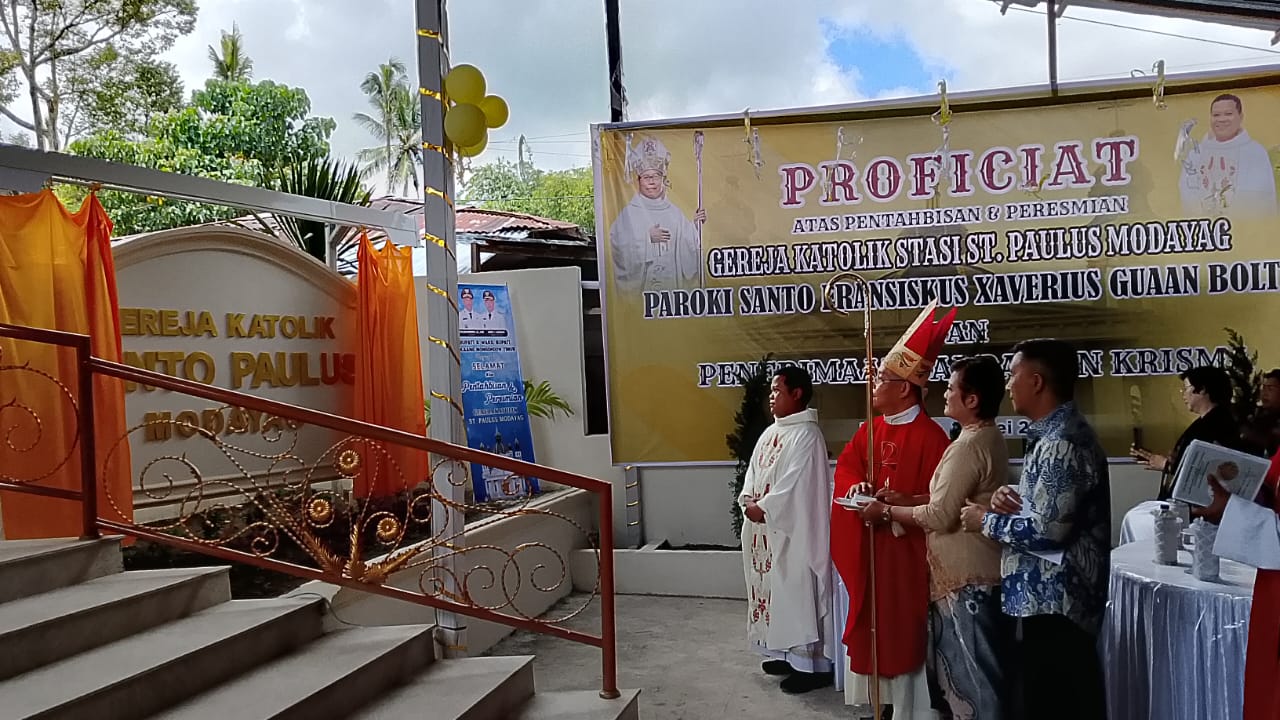 IKNews, BOLTIM – Wakil Bupati Bolaang Mongondow Timur (Boltim), Argo V. Sumaiku, didampingi Wakil Ketua TP-PKK Ny. Lucia Kristina Sumaiku Mokoginta, meresmikan Gereja Katolik Stasi ST. Paulus Modayag paroki Santo Fransiskus Xaverius Guaan Boltim dan penerimaan sakramen krisma, Kamis (29/5/2025).