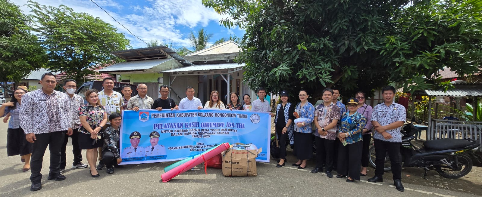 IKNews, BOLTIM – Wakil Bupati Bolaang Mongondow Timur Argo V. Sumaiku, menghadiri Pelayanan Kasih Oikumene ASN-THL untuk korban banjir desa Togid dan Buyat dalam rangka Perayaan Paskah Tahun 2025 dengan tema “Damai Sejahtera Kristus di Tengah Keluarga (BDK.YOH 20 : 26)”. Bertempat di Kantor Kemenag Boltim pada Kamis,(15/5/ 2025).