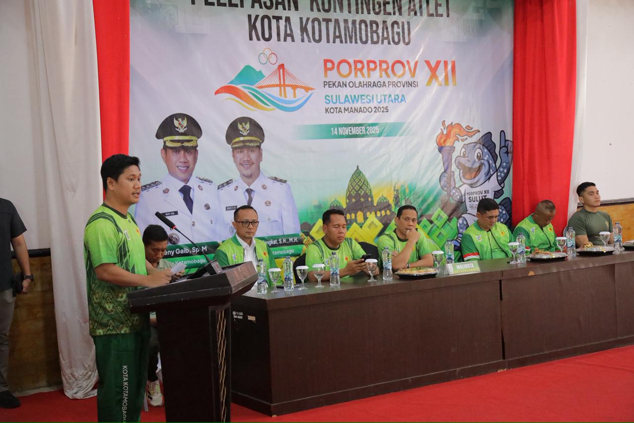 IKNews, Kotamobagu – Ketua KONI Kota Kotamobagu, Rendy Virgiawan Mangkat, S.H., M.H., memberikan dukungan penuh kepada 367 atlet yang akan mewakili Kota Kotamobagu pada Pekan Olahraga Provinsi (Porprov) XII Sulawesi Utara Tahun 2025. Dukungan tersebut disampaikan saat acara pelepasan kontingen di Aula Rumah Dinas Wali Kota, Jumat (14/11/2025).