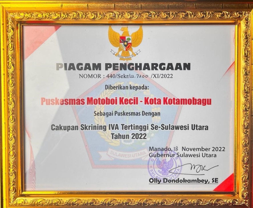 IKNews, KOTAMOBAGU – Puskesmas Motoboi Kecil, Kecamatan Kotamobagu Selatan, meraih penghargaan kategori Cakupan Skrining IVA (Inspeksi Visual Asetat) Tertinggi se-Sulawesi Utara, Sabtu (19/11/2022), di Ruang Mapalus Kantor Gubernur Sulawesi Utara.