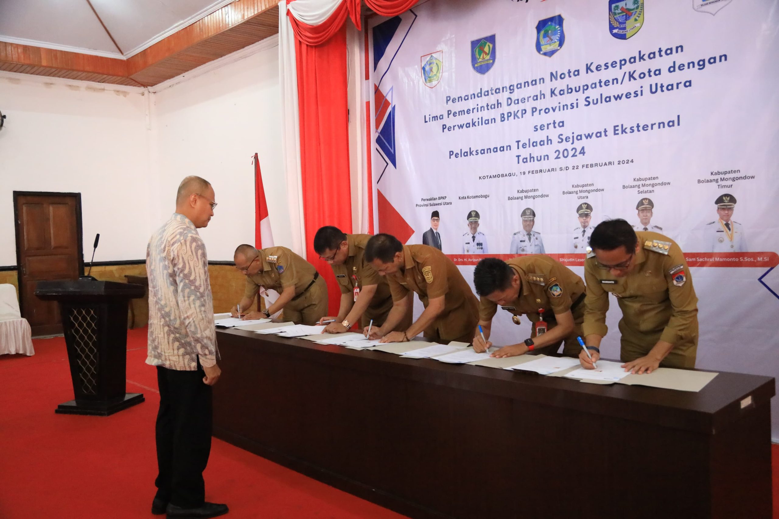 IKNews,Kotamobagu – Pj. Wali Kota Kotamobagu, Dr. Drs. Hi. Asripan Nani., M.Si., bersama empat kepala daerah se-Bolaang Mongondow Raya menandatangani Nota Kesepakatan dengan perwakilan BPKP Provinsi Sulawesi Utara terkait pengawasan penyelenggaraan pemerintahan daerah. Penandatanganan tersebut berlangsung pada Senin, 19 Februari 2024, di Aula Rumah Dinas Wali Kota Kotamobagu.