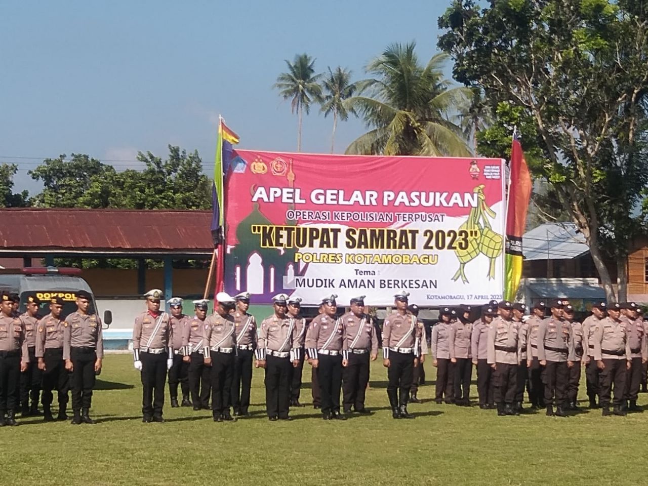 ADVERTORIAL, PEMKOT KOTAMOBAGU – Wali Kota Kotamobagu, Tatong Bara memimpin apel gelar pasukan Operasi Ketupat Samrat 2023 dalam rangkang pengamanan mudik dan perayaan hari raya idul fitri 1444 Hijriah yang dilaksanakan di Lapangan Aruman Motoboi Kecil, Kecamatan Kotamobagu Selatan, Senin (17/4/2023).