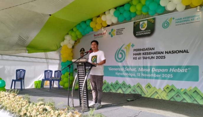IKNews, Kotamobagu – Wakil Wali Kota Kotamobagu, Rendy Virgiawan Mangkat menghadiri peringatan Hari Kesehatan Nasional (HKN) ke-61 yang digelar di halaman RSUD Kota Kotamobagu, Kelurahan Pobundayan, Rabu 12 November 2025. Tahun ini, HKN mengusung tema “Generasi Sehat, Masa Depan Hebat” yang menekankan pentingnya menciptakan masyarakat sehat dan generasi muda yang tangguh.