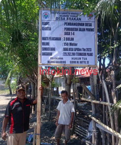 IKNews,Minsel – Pemerintah Desa (Pemdes) Arakan Kecamatan Tatapaan Kabupaten Minahasa Selatan, Realisasikan Dana Desa (DD) Tahun Anggaran 2023 melalui Pelaksanaan Pembangunan Desa, Kegiatan Pembuatan Jalan Paving, sebagaimana tercantum dalam daftar Anggaran Pendapatan Belanja Desa (APBDes) serta Papan Informasi Kegiatan DD.