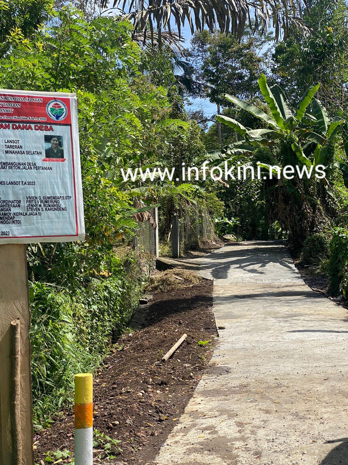 IKNews,Minsel – Pemerintah Desa (Pemdes) Lansot Kecamatan Tareran Kabupaten Minahasa Selatan, Realisasikan Dana Desa (DD) Tahun Anggaran 2023 melalui Bidang Pelaksanaan Pembangunan Desa, Kegiatan Pembangunan Rabat Beton Jalan Pertanian, sebagaimana tercantum dalam daftar Anggaran Pendapatan Belanja Desa (APBDes) serta Papan Informasi Kegiatan DD.