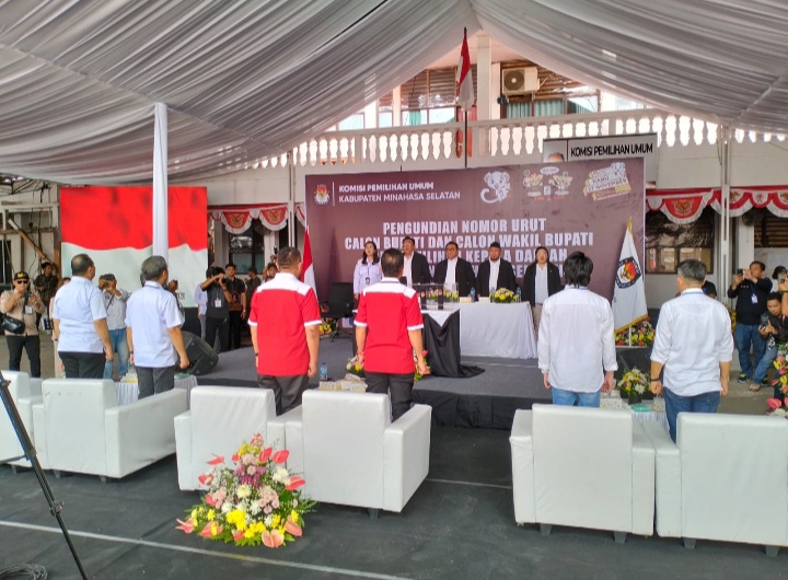 Minsel – Nomor urut yang diperoleh masing-masing calon, melalui proses cabut undi dalam rapat pleno terbuka pengundian nomor urut yang digelar Komisi Pemilihan Umum (KPU), Senin (23/09/2024), siang tadi.