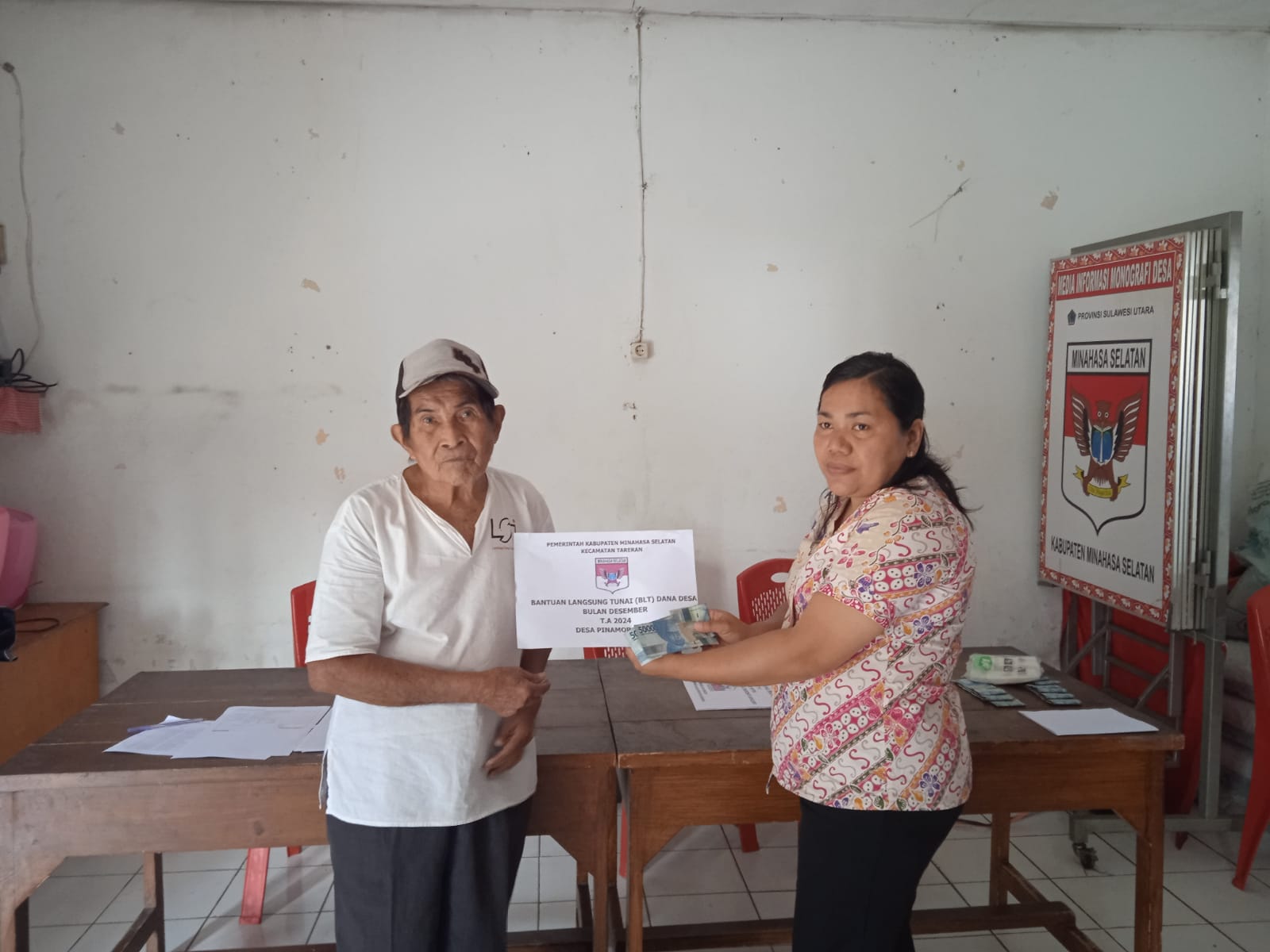 IKNews,Minsel – Pemerintah Desa (Pemdes) Pinamorongan Salurkan Bantuan Langsung Tunai – Dana Desa (BLT – DD) Bulan Desember berjumlah Rp.300.000 kepada 25 Keluarga Penerima Manfaat (KPM), di Balai Pertemuan Umum (BPU) Desa Pinamorongan pada Senin (16/12/2024).