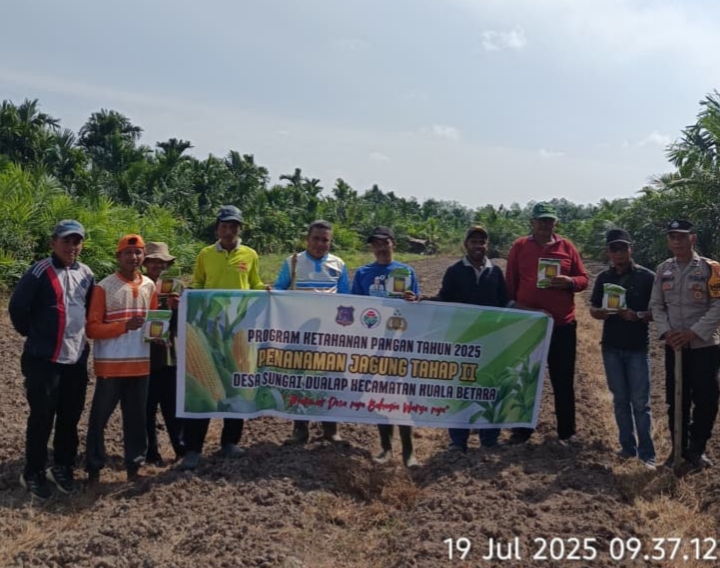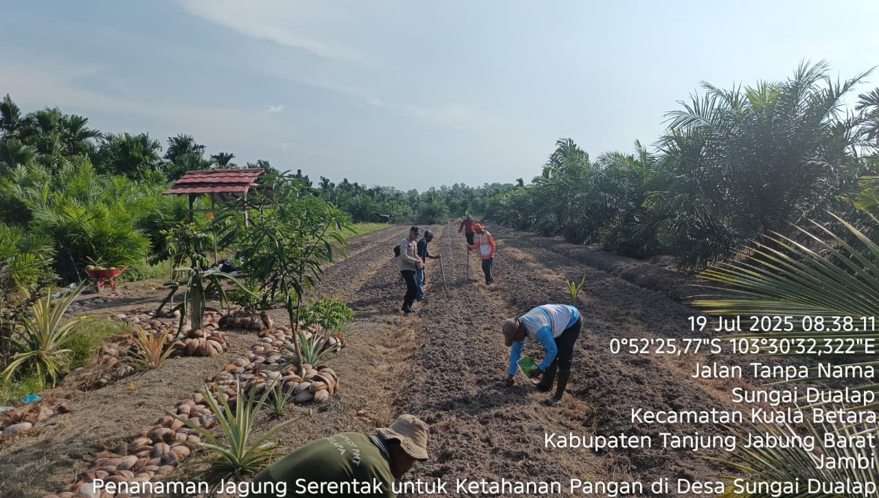 IKNews, Kuala Betara – Dalam upaya mendukung program ketahanan pangan nasional tahun 2025, Desa Sungai Dualap, Kecamatan Kuala Betara, Kabupaten Tanjung Jabung Barat, melaksanakan kegiatan penanaman jagung tahap II pada Jum’at (19/7/2025). Kegiatan ini menjadi salah satu langkah konkret pemerintah desa dalam mendukung swasembada pangan dan meningkatkan kesejahteraan masyarakat desa.