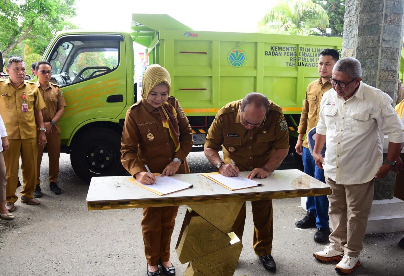 Gambar: Penandatanganan berita acara penyerahan 1 unit truk sampah hasil aspirasi Anggota DPR RI Komisi XII Rusli Habibie, oleh Wakil Gubernur Gorontalo Idah Syahidah Rusli Habibie bersama Wali Kota Gorontalo Adnan Dambea, di halaman Kantor Wali Kota, Selasa (2/9/2025). (Foto : Diskominfotik Provinsi Gorontalo).