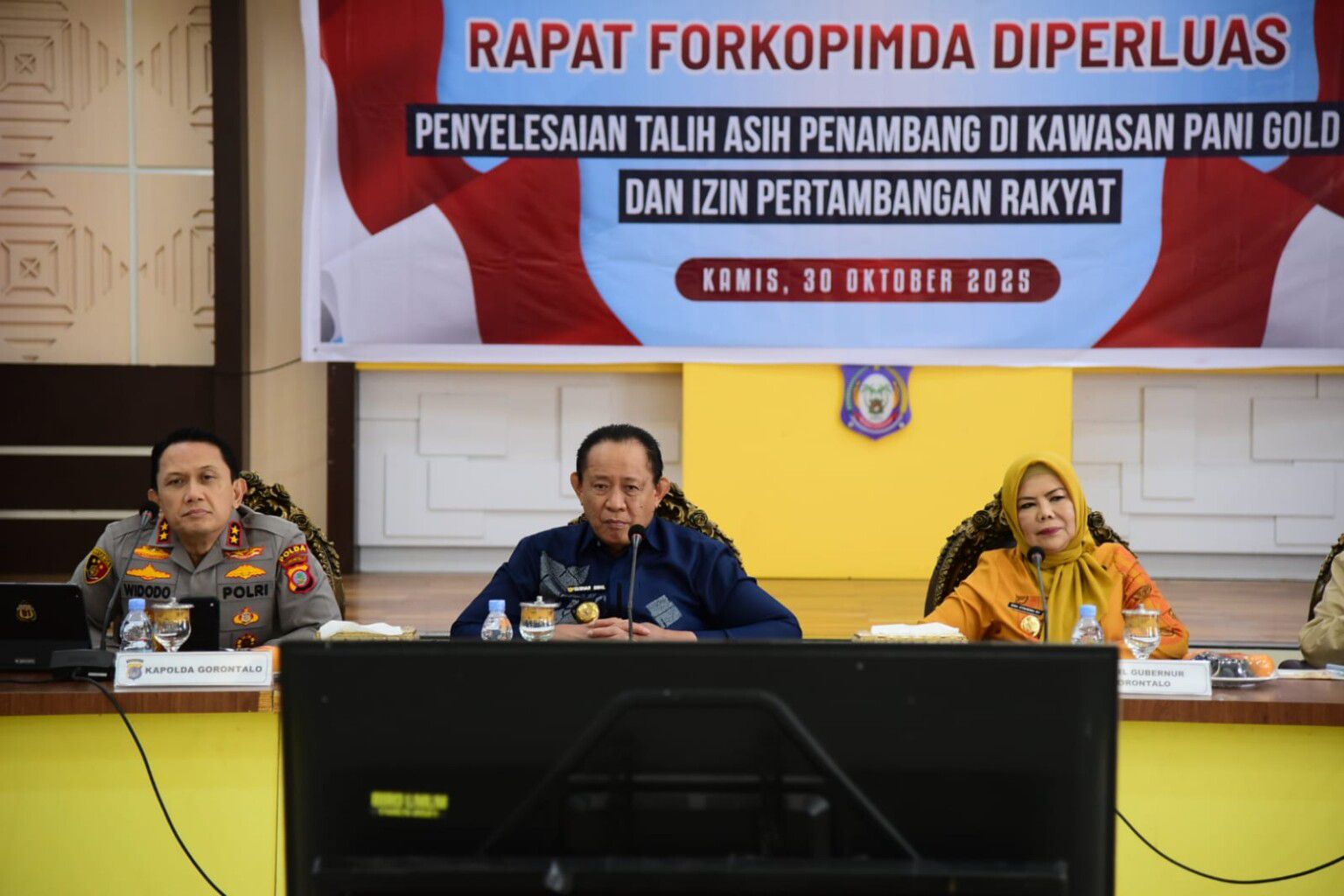 Gambar: Gubernur Gorontalo, Gusnar Ismail, memimpin rapat diperluas Forkopimda Provinsi Gorontalo membahas penyelesaian tali asih penambang dan rencana pembentukan Izin Pertambangan Rakyat (IPR), di Aula Kantor Gubernur Gorontalo, Kamis (30/10/2025). Foto: Adit/IKN.