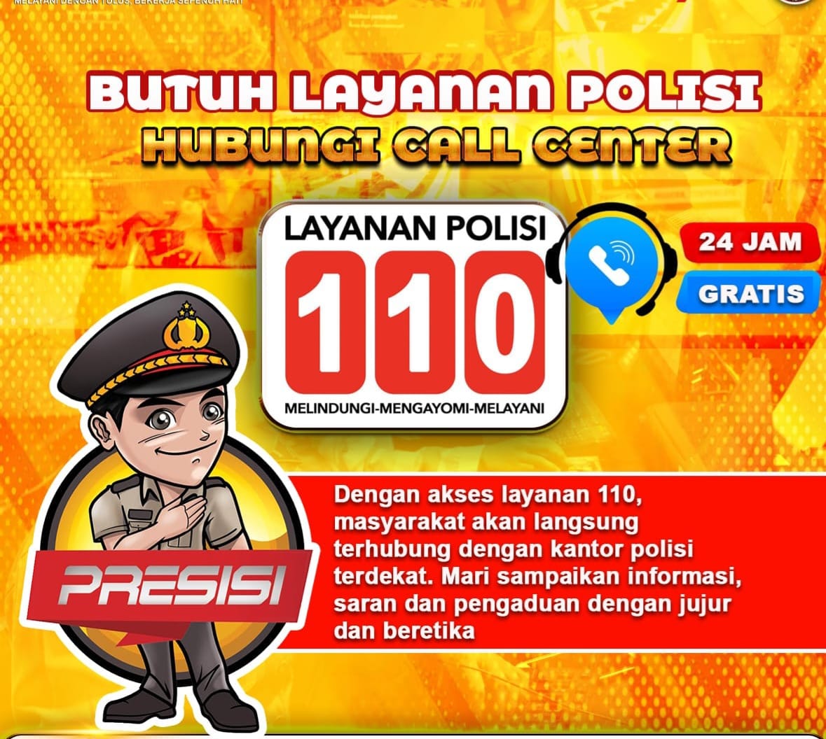 Layanan 110 merupakan saluran resmi Kepolisian Republik Indonesia yang beroperasi selama 24 jam dan dapat diakses tanpa biaya. Hotline ini disiapkan untuk menerima laporan gangguan keamanan, tindak pidana, maupun kondisi darurat yang membutuhkan respons cepat petugas di lapangan.