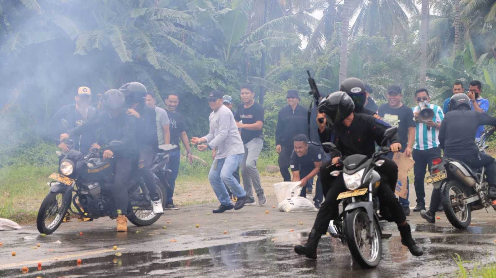 Dalam simulasi sispamkota, diskenariokan bahwa ada sekelompok massa yang tidak menerima hasil perhitungan suara sehingga melakukan unjuk rasa, Polres Boltim berupaya membubarkan massa yang mulai anarkhis.