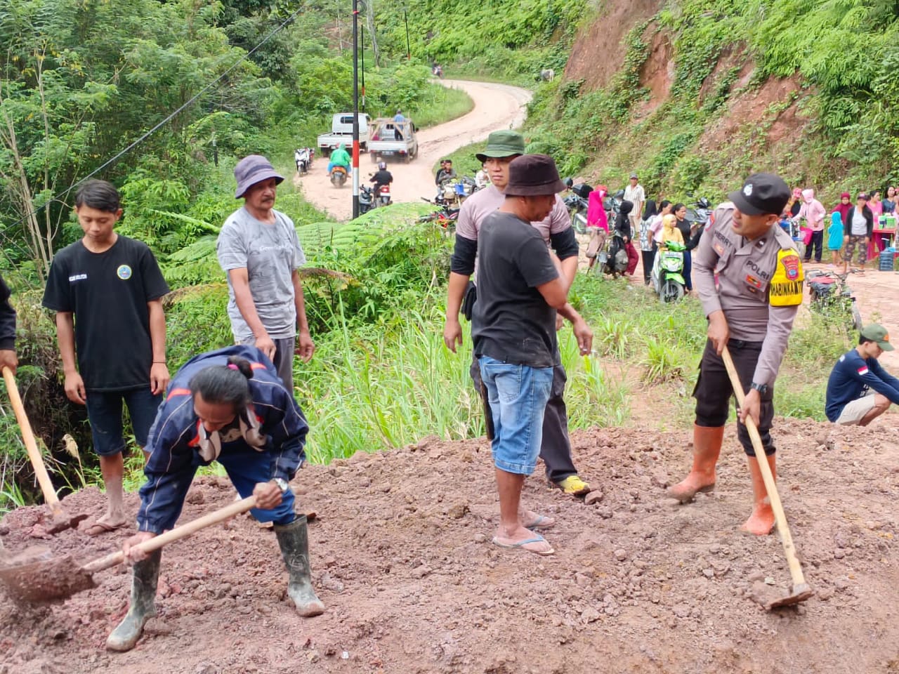 IKNews, BOLTIM – Demi kelancaran aktivitas masyarakat Kepolisian Polres Bolaang Mongondow Timur (Boltim), melalui Polsek Modayag melakukan kerja bhakti bersama masyarakat membersikan dan membuka akses jalan trans Sulawesi bertempat Desa Badaro, Kecamatan Modayag yang tertutup material longsor, Rabu (17/7/2024).