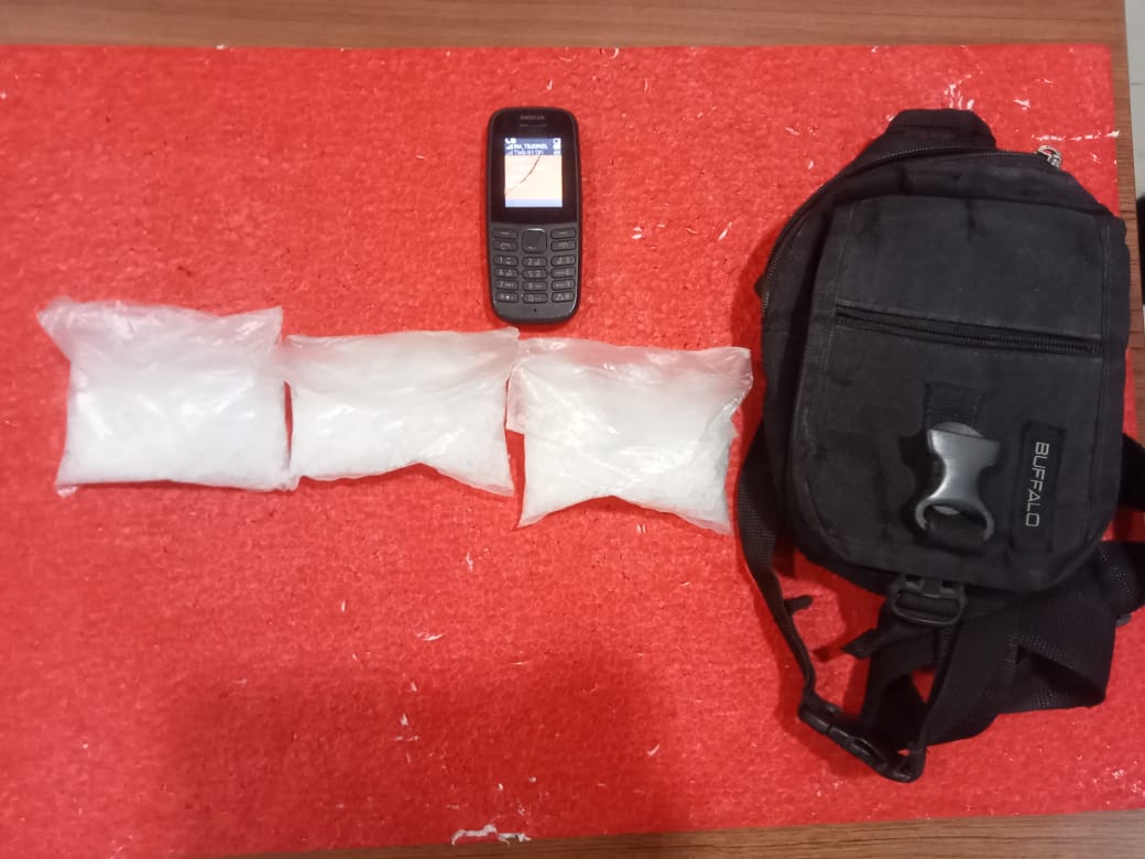 “Ketika dilakukan penggeledahan badan, ditemukan barang bukti 3 bungkus plastik transparan yang diduga Sabu di dalam tas sandang warna hitam milik pelaku,” ujarnya.