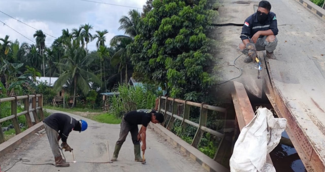 IKNews, KUALA BETARA – Sabtu pagi (15/11/2025), suasana di RT 9 Desa Tanjung Pasir, Kecamatan Kuala Betara, tampak lebih ramai dari biasanya. Sejumlah pekerja teknis PT Felda Indo Mulia (FIM) terlihat menurunkan peralatan dan melakukan pemeriksaan di atas jembatan yang menjadi akses utama warga. Sebagian papan lantai jembatan tampak jebol, meninggalkan lubang yang cukup berbahaya bagi pengguna jalan.