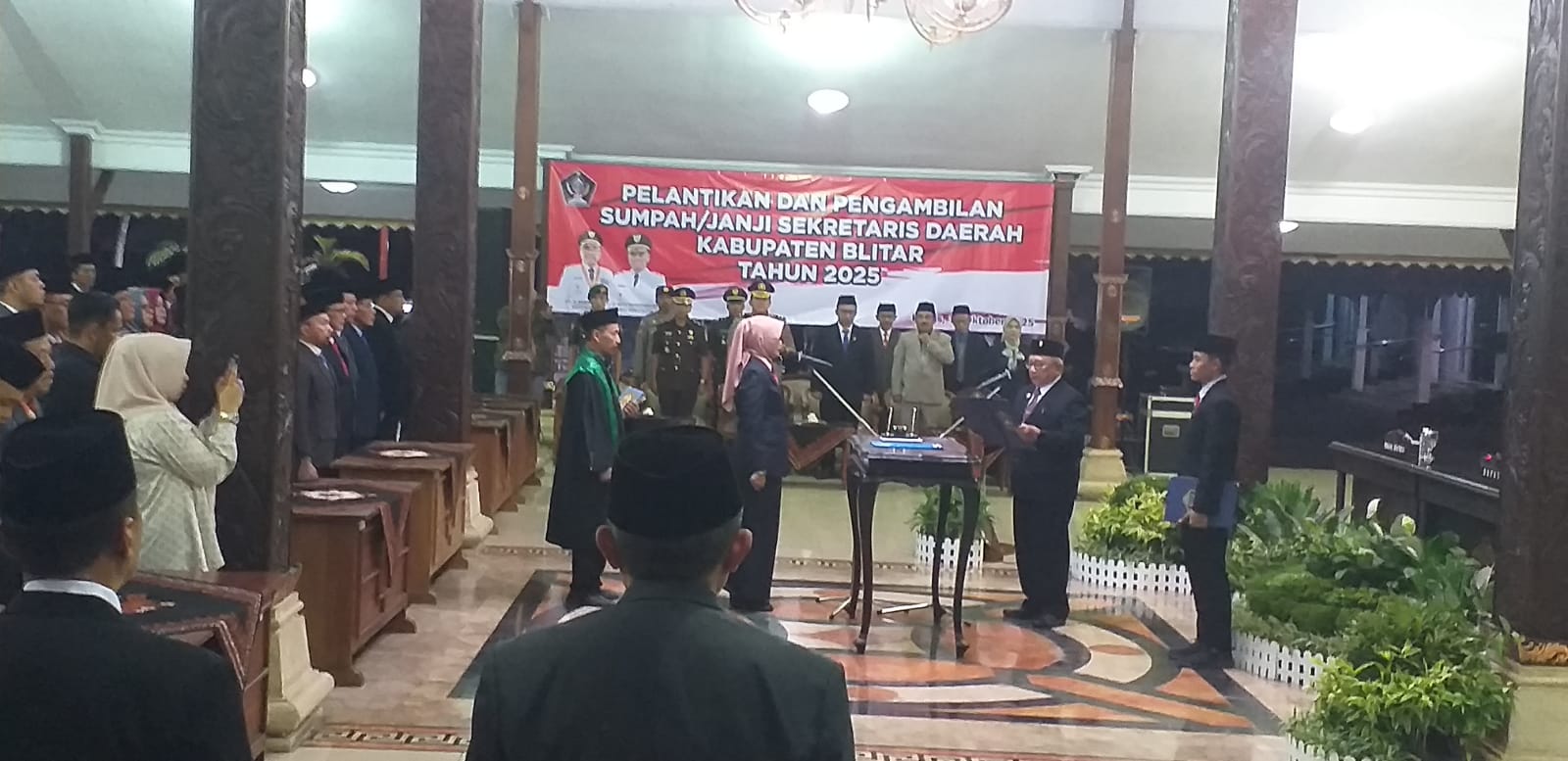 Gambar: Bupati Blitar Rijanto resmi melantik Khusna Lindarti sebagai Sekretaris Daerah (Sekda) Kabupaten Blitar dalam acara pelantikan dan pengambilan sumpah janji jabatan di Pendapa Ronggo Hadi Negoro, Kamis (16/10/2025) malam, Foto: Son.