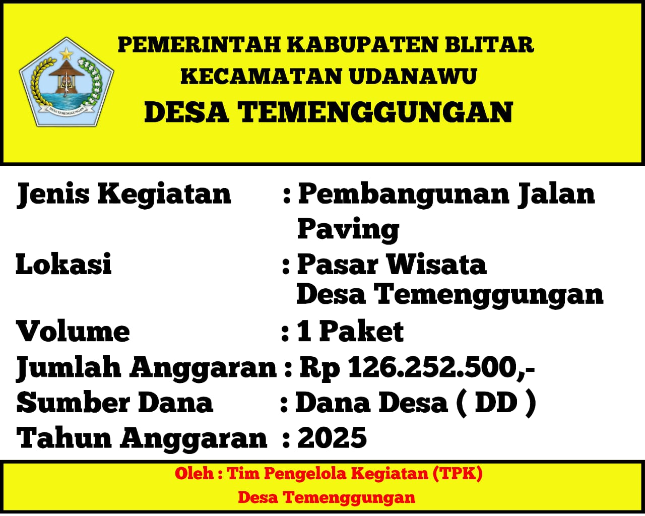 Kegiatan Pembangunan Pasar Wisata ini berlokasi di Lapangan Desa Temenggungan dengan perkiraan waktu pelaksanaan pada bulan Maret sampai dengan Juni. Yang kedua pembangunan Gedung BumDes berlokasi di Lapangan Desa Temenggungan waktu pelaksanaan bulan Februari sampai Maret 2025, yang mana sumber dana dari keduanya berasal dari Dana Dena (DD).