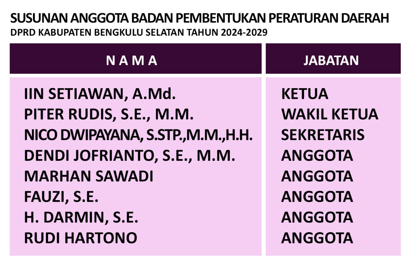 Adapun susunan alat kelengkapan DPRD Kabupaten Bengkulu Selatan, sebagai berikut :