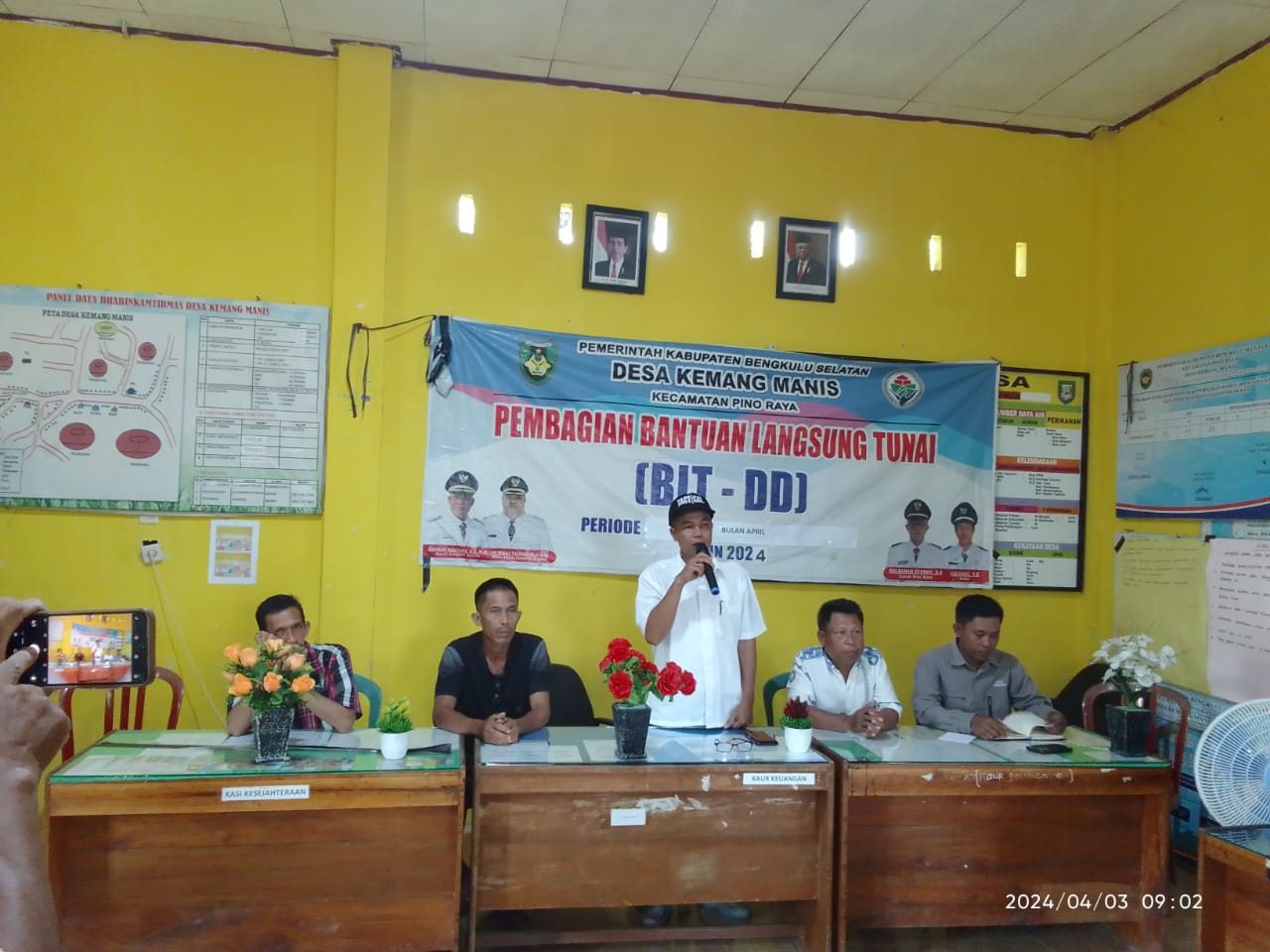IKNews, BENGKULU SELATAN – Pemerintah Desa (Pemdes) Kemang manis, Kecamatan Pino Raya, Kabupaten Bengkulu Selatan, sukses menyalurkan Bantuan Langsung Tunai Dana Desa (BLT-DD) tahap Ke- 2 tahun anggaran 2024. (03/04/2024).