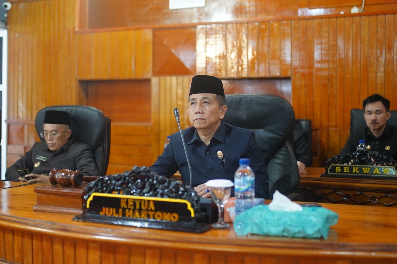 Rapat paripurna dipimpin Ketua DPRD, Juli Hartono, S.E, M.A.P, didampingi Wakil Ketua I, Holman, S.E dan Wakil Ketua II, Dodi Martian, S.Hut, M.M. Serta diikuti Anggota DPRD dari semua unsur fraksi.