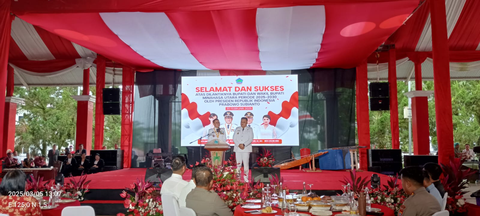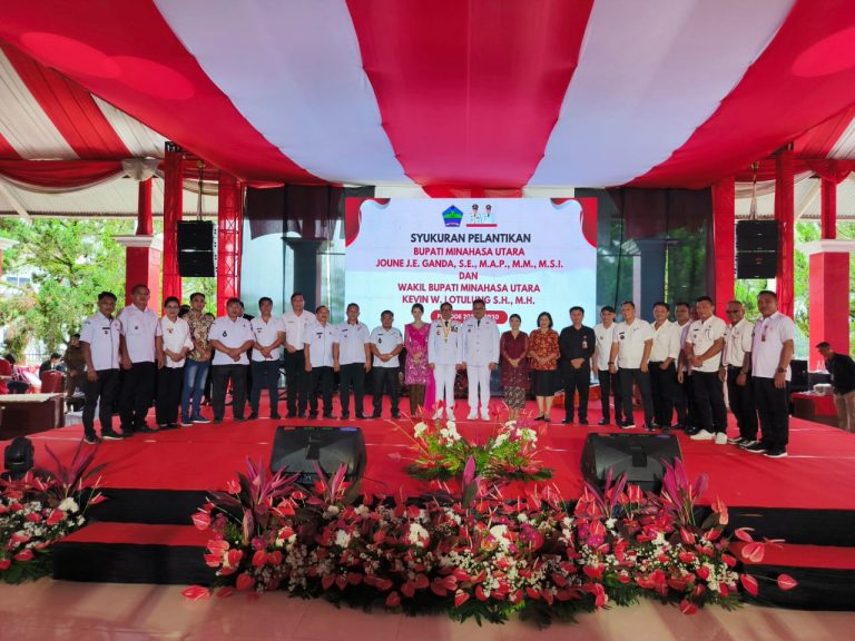 IKNews, MINUT – Bupati Joune James Esau Ganda, SE, MAP, MM, M.Si dan Wakil Bupati Kevin Wiliam Lotulung, SH, MH, bersama Pemerintah dan Masyarakat kabupaten Minahasa Utara melaksanakan Syukuran atas Kepercayaan Masyarakat untuk JGKWL di periode kedua oleh Presiden Prabowo Subianto di Istana Negara pada 20 Februari lalu bersama kepala-kepala daerah Se Indonesia, di Pendopo kantor Pemkab Minut. Rabu. 5/3/2025.
