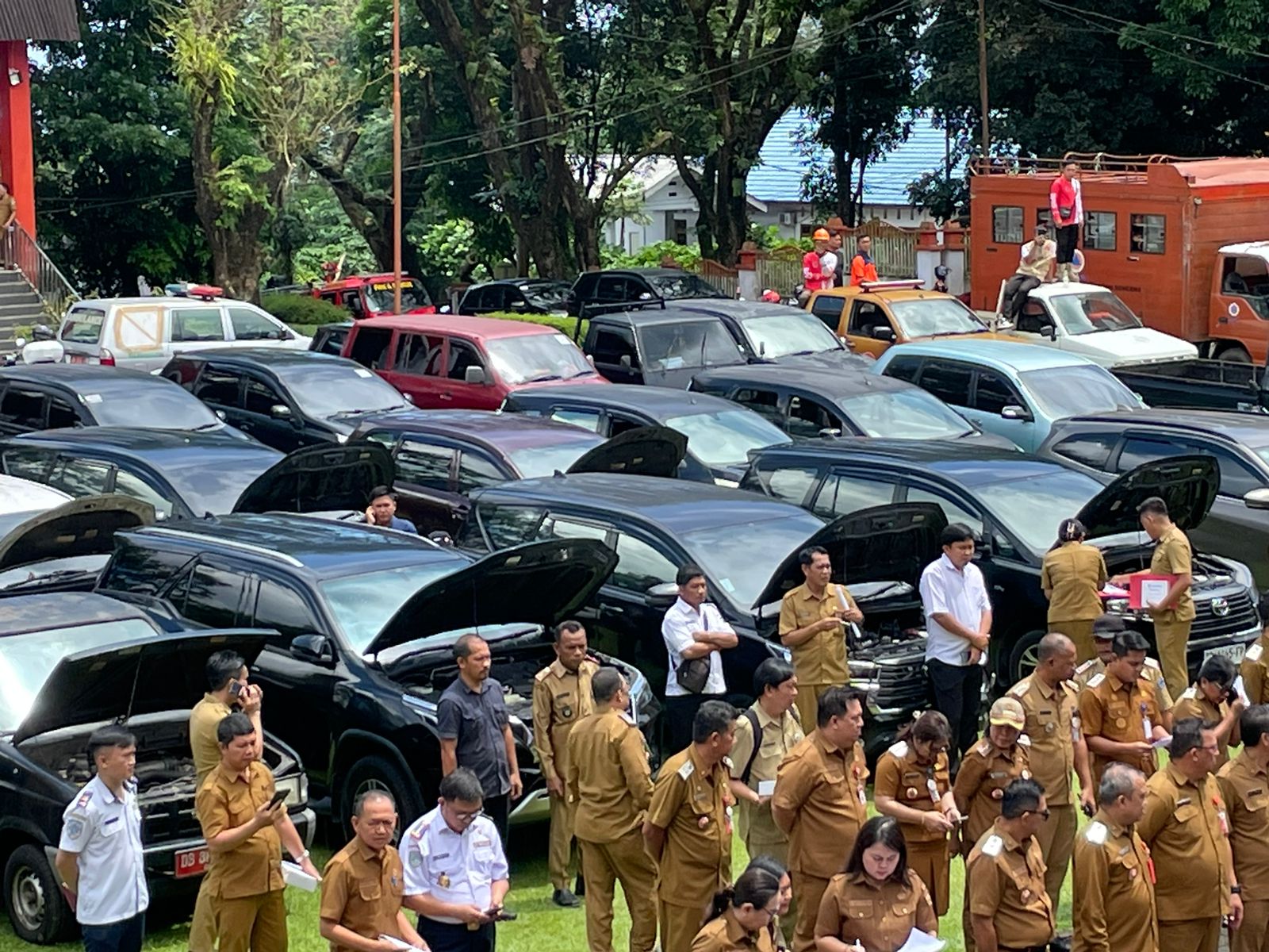 Bupati Joune J E Ganda, langsung mengecek kendaraan, di dampingi kepala OPD di masing-masing, dalam pengecekan aset kendaraan guna memastikan terawat serta terjaga sebaik mungkin.