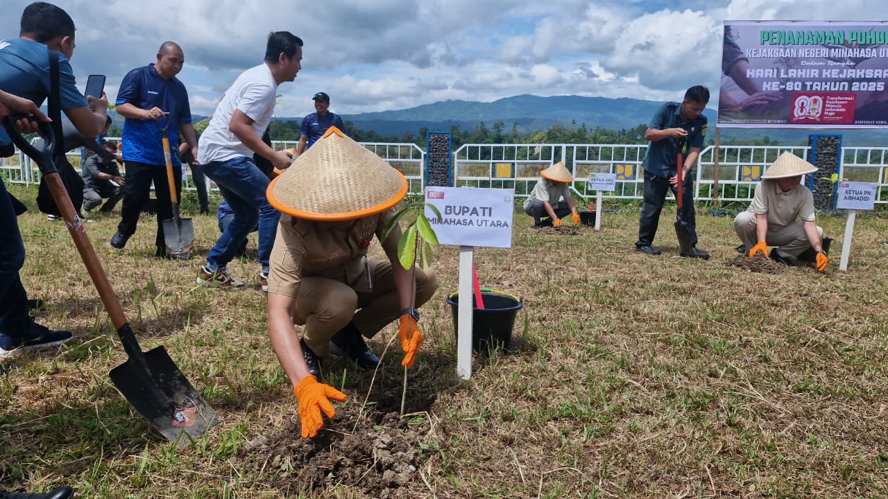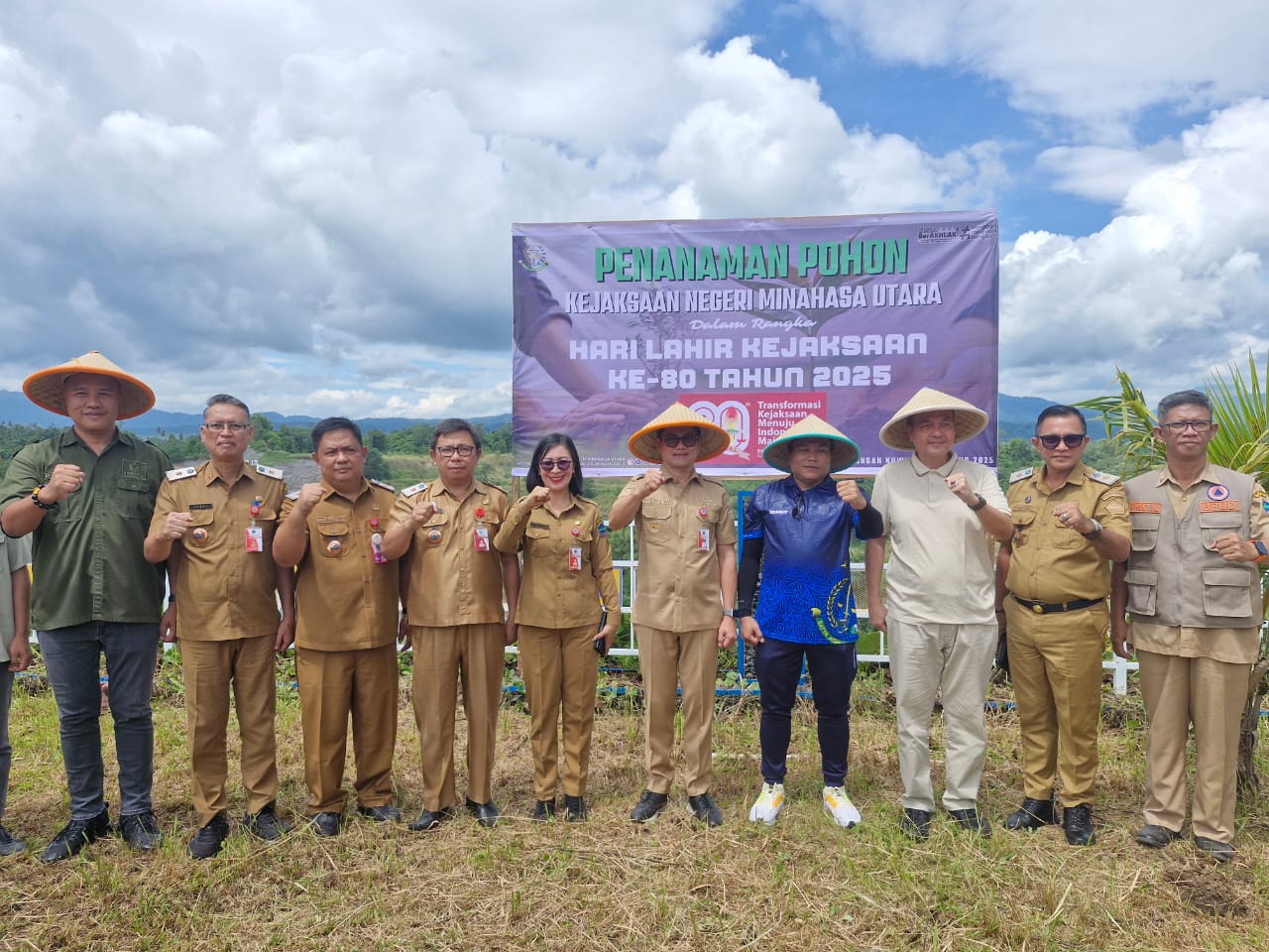 Gambar: Bupati Minahasa Utara Joune James Esau Ganda, SE., MAP., MM., M.Si. bersama Kajari Minut I Gede Widhartama, SH., MH., dan jajaran Forkopimda menanam pohon di area Bendungan Kuwil dalam rangka memperingati Hari Lahir Kejaksaan ke-80, Selasa (19/8/2025).