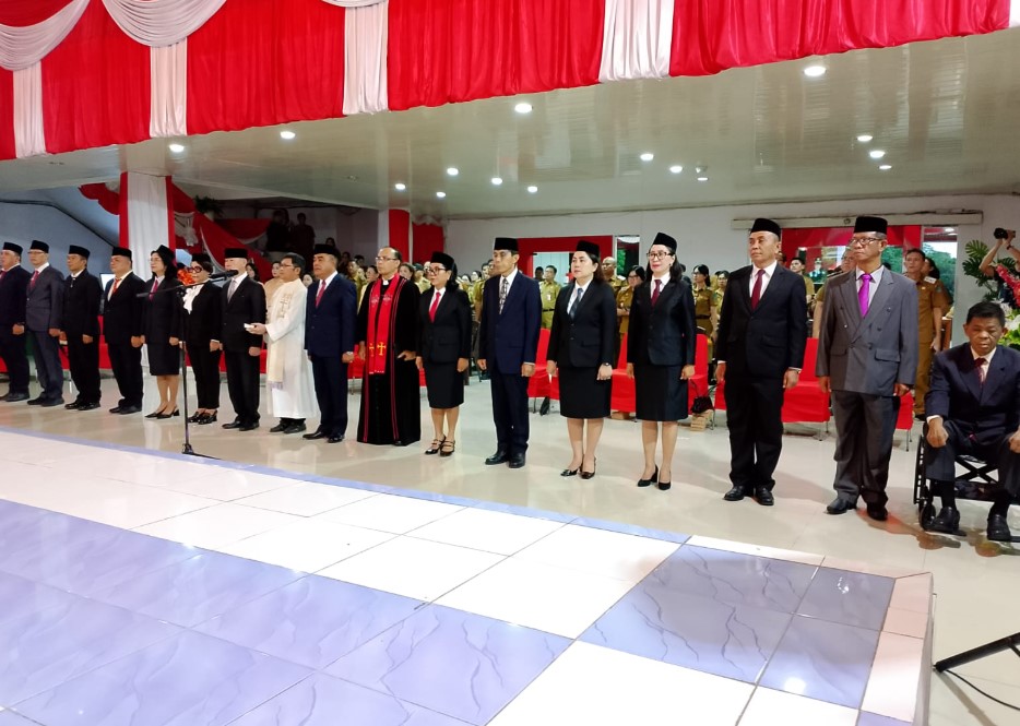 Bupati Joune James Esau Ganda, SE, MAP, MM, M.Si bersama Wakil Bupati Kevin William Lotulung, SH, MH memimpin langsung prosesi pelantikan di Atrium Kantor Bupati Minahasa Utara, Selasa (7/10/2025), disaksikan Sekretaris Daerah Ir. Novly Wowiling, M.Si, Kepala BKPSDM Yohanes Katuuk, S.STP., M.A.P., serta para kepala perangkat daerah.